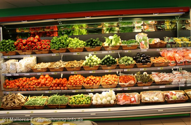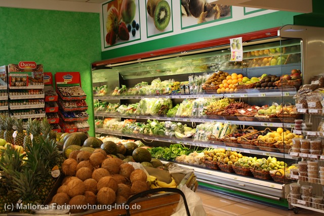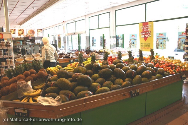 Neben vielen Lebensmitteln und Weinen, auch aus mallorquinischer Produktion, bietet dieser Supermarkt eine besonders reichhaltige und appetitlich präsentierte Obst- und Gemüseabteilung.